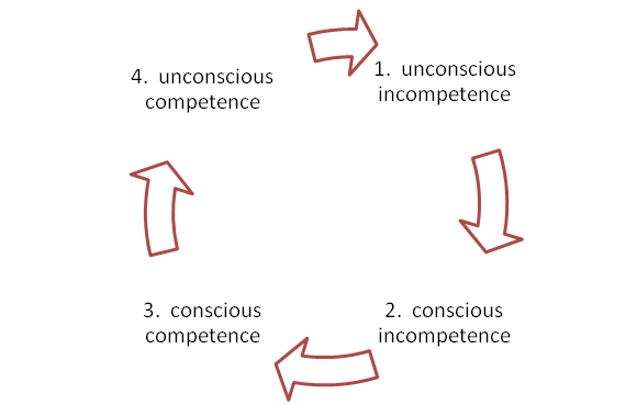 Now, why have I bought this to your attention? Well my brain made the comedic connection when reading this thought-provoking CPD23 post by Sheila Webber. I am a battle-scarred old war-horse of a library worker and this post struck several sonorous chords. I have come across the Conscious Competence Model* before and had even worked it into some information skills training that I helped to write whilst at The OU (Information Skills for Researchers). What I had not come across was the idea that I could slide back around into unconscious incompetence (from 4. to 1. in the diagram).