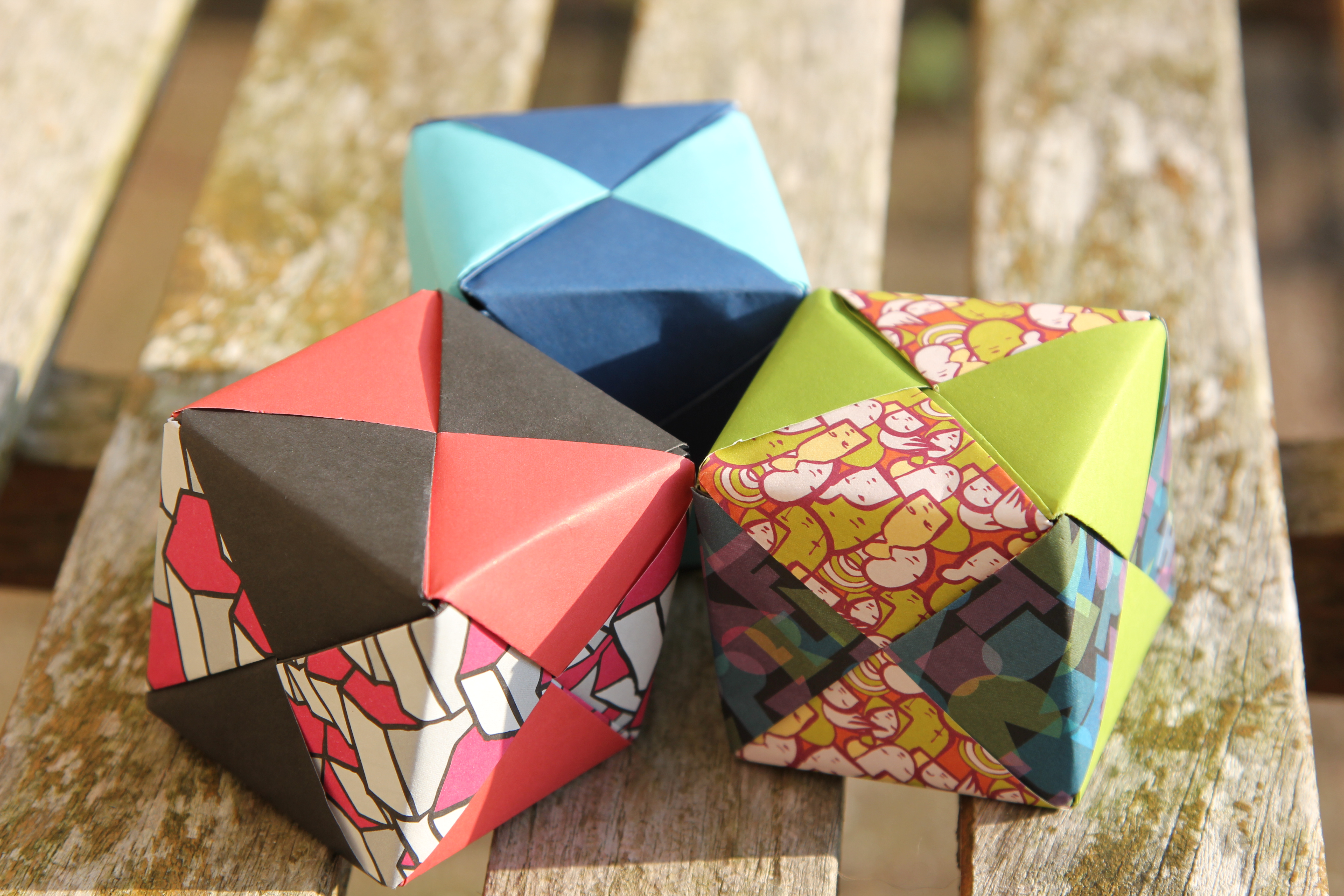 When putting the folded paper shapes together keep the flaps of adjoining pieces perpendicular to one another. All the flaps must be slotted into a side of the cube, no flaps should be loose inside the cube.
